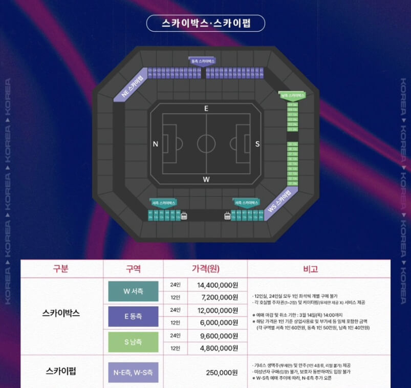 스카이박스와 스카이펍 티켓도 11일 오후 7시부터 구입할 수 있습니다. 스카이박스는 24인실과 12인실 두 가지가 있습니다. 스카이펍은 기네스 생맥주 및 안주가 제공되기 때문에 미성년자는 입장할 수 없습니다.