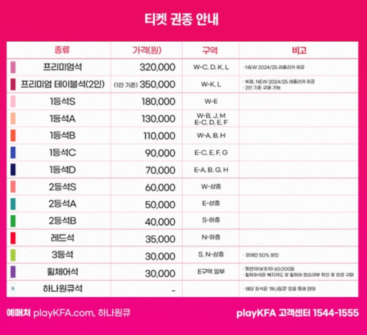 좌석은 프리미엄석, 1~3등석, 응원석(레드석), 휠체어석으로 구분되며, 가격은 3만원부터 32만원까지 다양합니다.