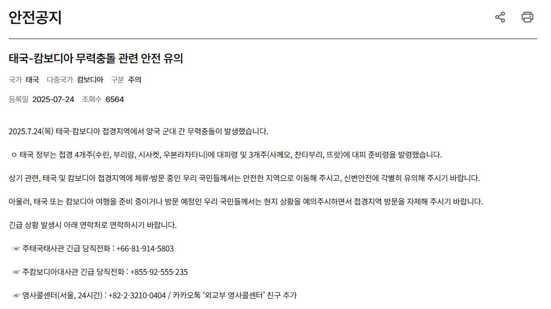 해당 지역은 태국과의 접경지로, 과거에도 무력 충돌이 빈번하게 발생한 곳입니다. 외교부는 여행 취소 및 현지 체류자의 철수를 강력히 권고하고 있습니다.