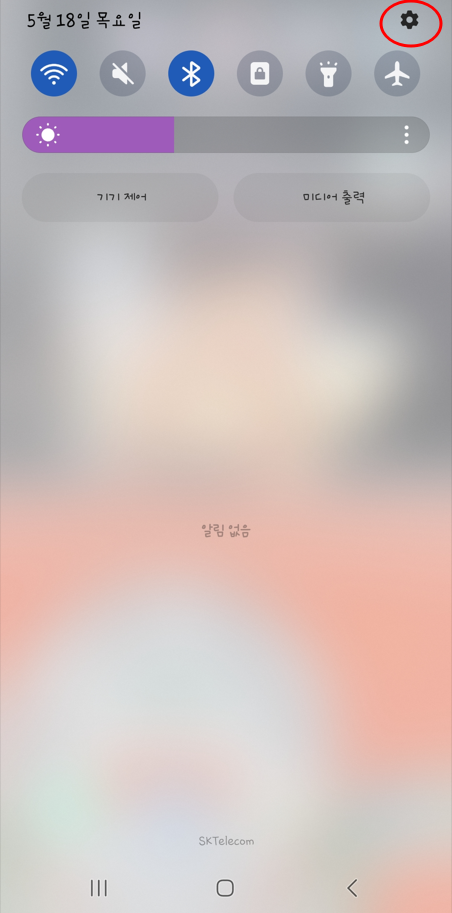 1. 갤럭시 화면 상단 부분을 하단으로 내려보신 후 톱니바퀴를 터치하시면 설정창으로 이동합니다.
