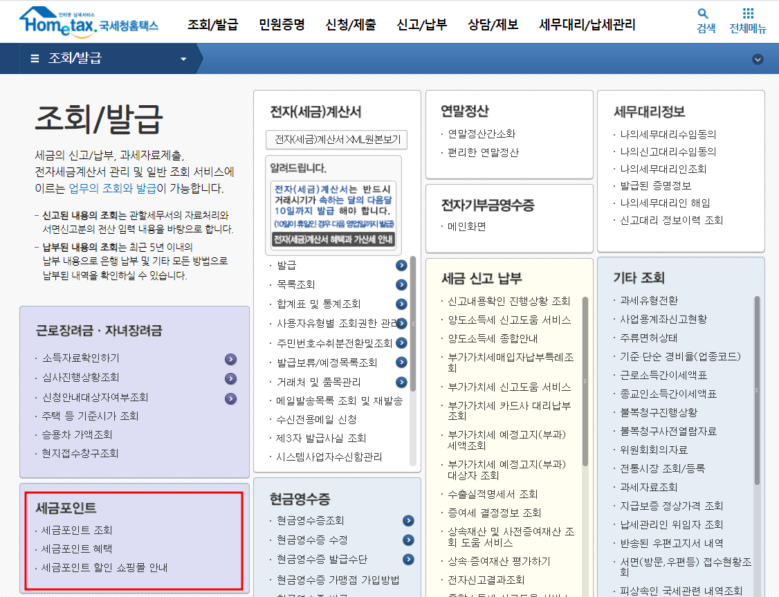 홈택스 : 로그인 → 조회/발급 → 세금포인트 → 세금포인트 조회를 하시면 됩니다.